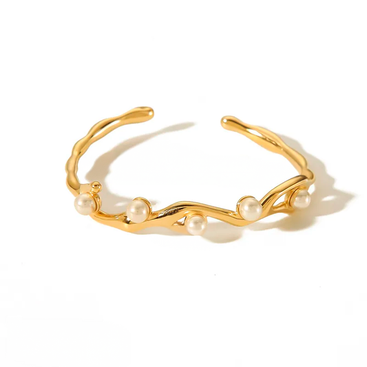 Brazalete Jazmín de Acero de Titanio – Dorado Abierto con Perlas Sintéticas