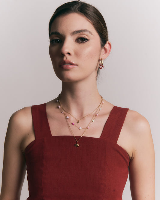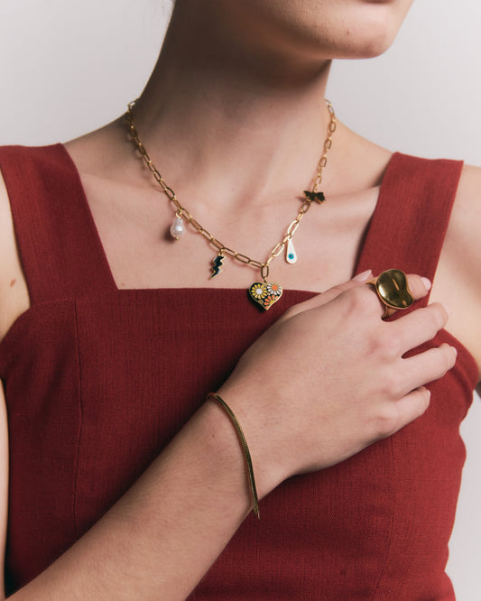 Collar Barlovento – Diseño Simbólico en Titanio Dorado con Charms de Corazón, Sol y Piedra Marmoleada