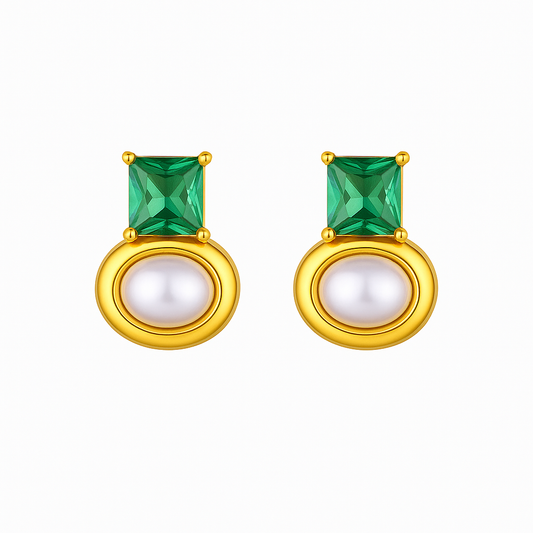 Aretes Bari – Diseño Clásico en Titanio Dorado con Circonia Facetada y Perla Blanca Ovalada