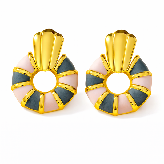 Aretes Leana – Diseño Geométrico en Acero Inoxidable con Resina Marfil y Ámbar, Estilo Retro Chic
