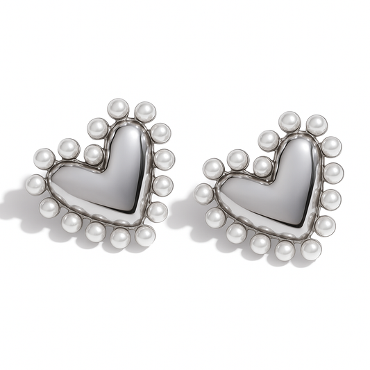 Aretes Amore Blanc – Diseño en Titanio Bicolor con Forma de Corazón y Borde de Perlas Blancas