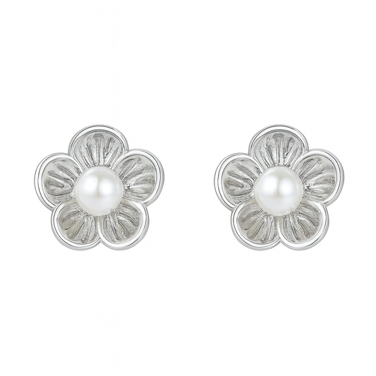 Aretes Dalia – Diseño Floral en Titanio Dorado y Plateado con Perla Blanca