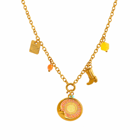 Collar Boho – Collar Dorado con Charms Simbólicos y Amuleto de Sol y Luna en Acero de Titanio