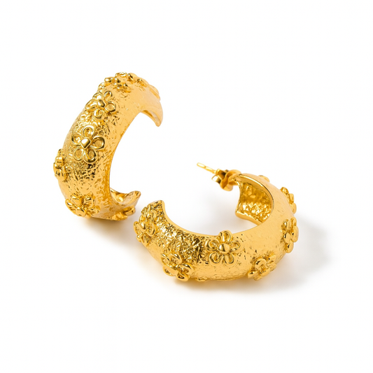 Aretes Gardenia – Aro Semiabierto con Acabado Martillado y Flores en Relieve