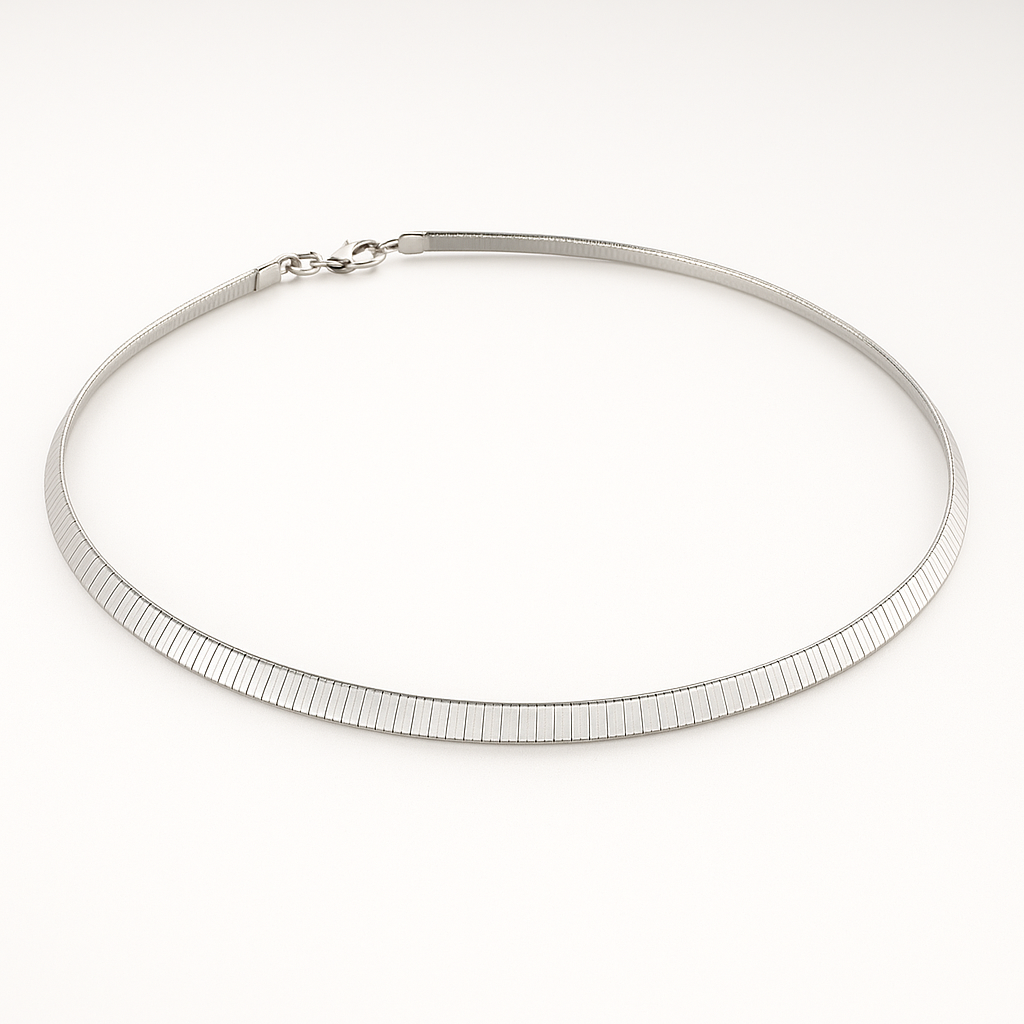 El Collar Castizo es una pieza que refleja sofisticación moderna en un diseño limpio y atemporal. Se trata de una cadena rígida estilo collar plano tipo choker, con acabado pulido espejo que refleja la luz de manera uniforme, otorgando un brillo elegante y distintivo.