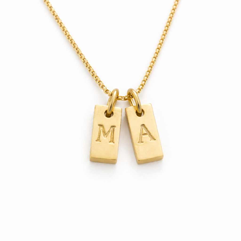 El diseño presenta dos dijes rectangulares, cada uno con iniciales grabadas a mano, lo que convierte esta pieza en un collar único y personalizable. Las líneas limpias y la superficie pulida de los dijes resaltan el grabado, logrando un equilibrio perfecto entre sencillez y significado. Puedes elegir llevar tus propias iniciales, las de una persona especial o combinar varias letras para contar una historia íntima y única.
