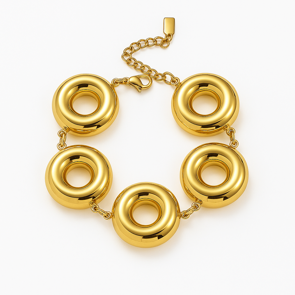 Está elaborado en acero de titanio hipoalergénico con baño dorado brillante, lo que le otorga durabilidad, resistencia al agua y un acabado espejo que refleja la luz con intensidad. Su estructura está compuesta por una serie de eslabones circulares grandes, de forma abombada y anillada, conectados entre sí mediante pequeños enlaces pulidos que aportan flexibilidad y movimiento natural.