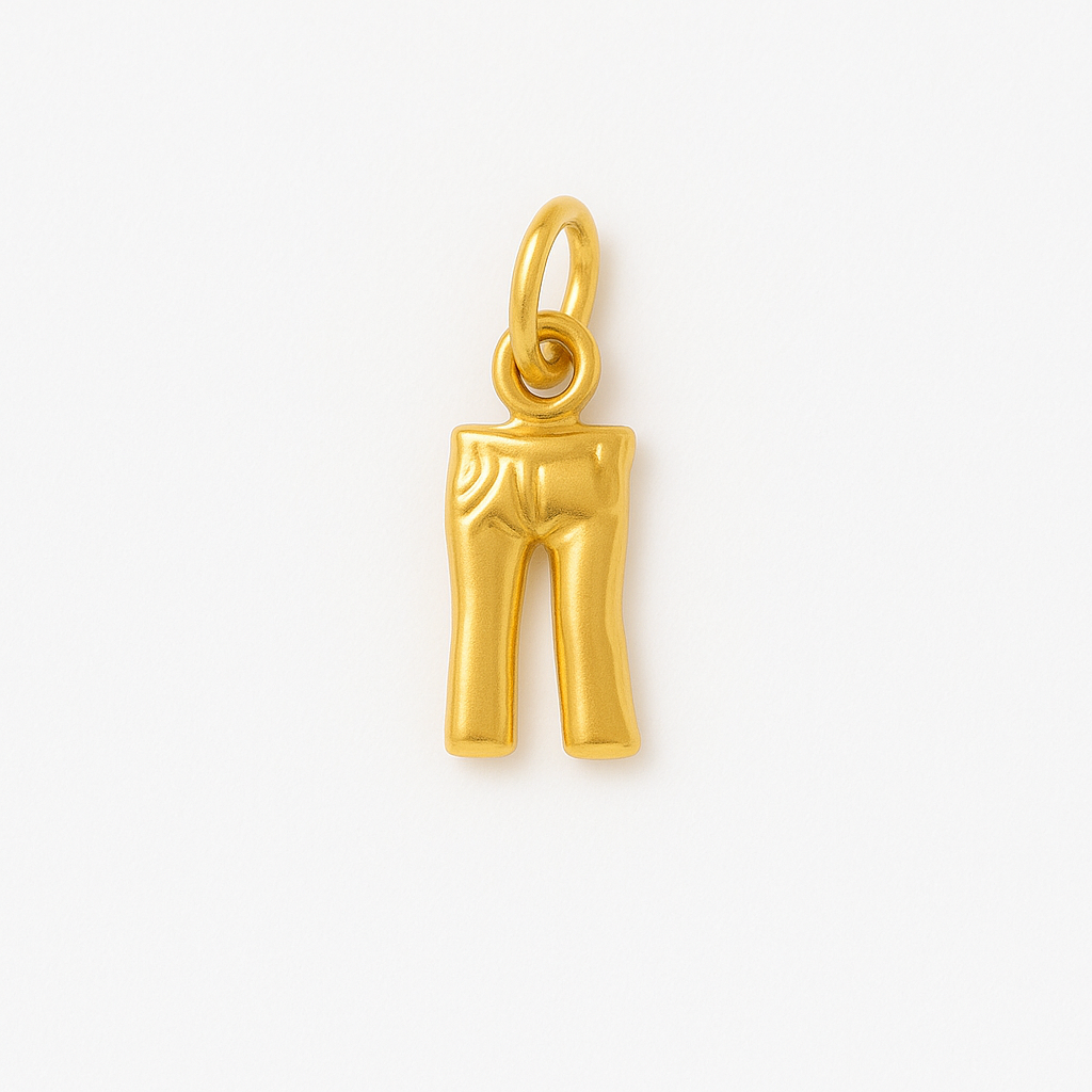 Elaborado en acero de titanio hipoalergénico con baño dorado brillante, este charm presenta una figura tridimensional de pantalón, trabajada con líneas suaves y proporciones equilibradas. Su acabado liso y uniforme refleja la luz con un brillo cálido, mientras que los ligeros relieves en la parte superior insinúan los pliegues y la cintura de la prenda, aportando un toque sutil de realismo y textura.
