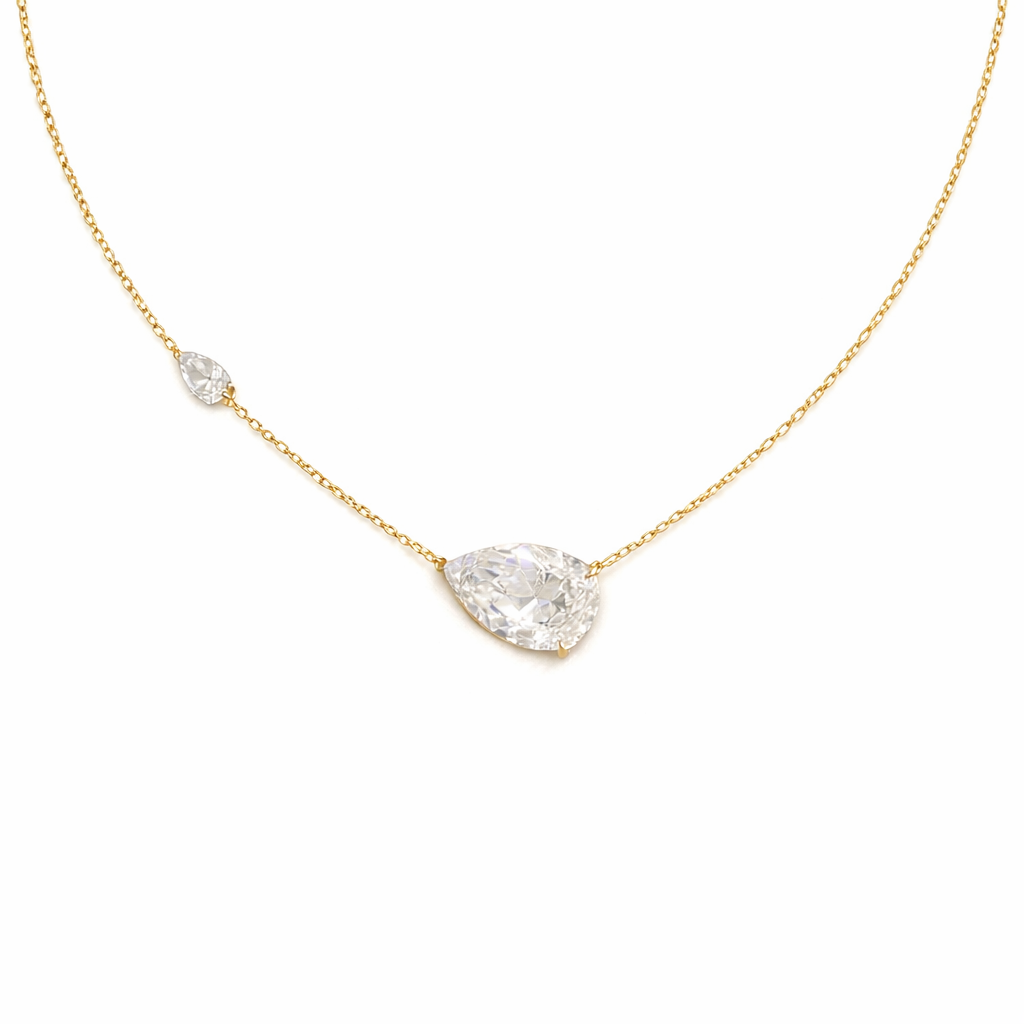 La silueta de la gota aporta una estética suave y femenina, convirtiendo a este collar en una pieza atemporal que se adapta con facilidad a distintos estilos. El cristal central actúa como punto focal, reflejando la luz desde distintos ángulos y aportando un brillo discreto que ilumina el rostro.